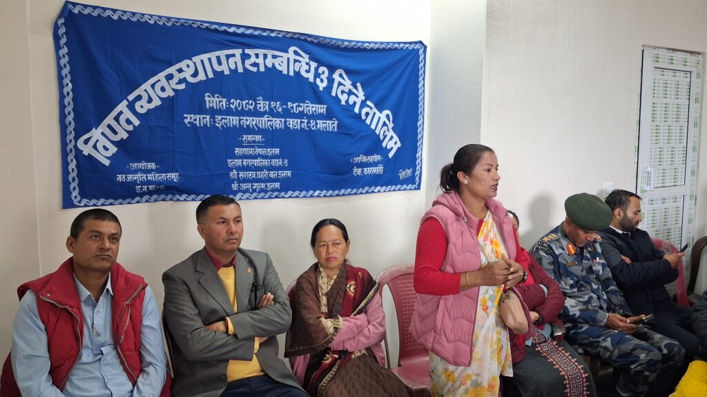 इलाम , १६ चैत : विपद व्यवस्थापन सम्बन्धी तीन दिवसीय तालिम इलाममा सुरु भएको छ । नवजागृती महिला समुहको आयोजनामा इलाम नगरपालिका ४ मा सोमबारदेखि सुरु भएको हो । विपद ब्यवस्थापन सम्बन्धि नागरिकलाई जानकारी गराई विपद पुर्व तयारीमा रहन सचेत गराउने उदेश्यले तालिमको आयोजना गरिएको नवजागृती महिला समुहकी अध्यक्ष रोशु बानियाँले बताउनु भयो ।